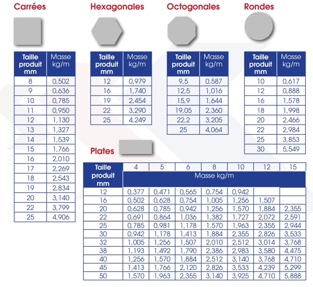 Tailles intermédiaires disponibles, y compris tailles impériales.
